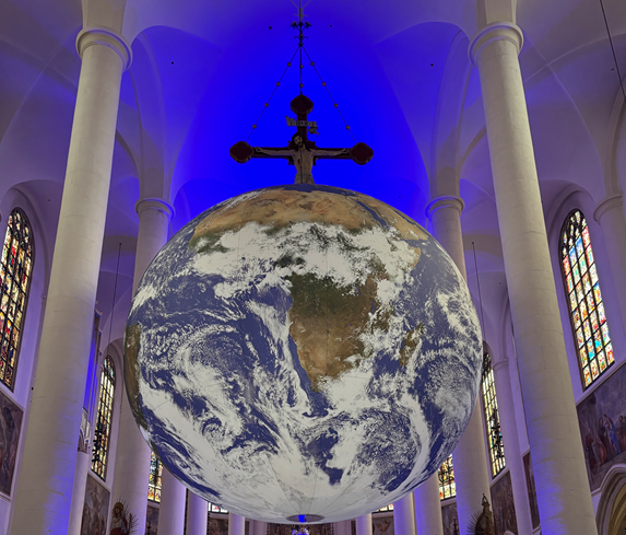 In der Basilika St. Jakob erwartete die Schülerinnen und Schüler ein ganz besonderes Erlebnis: Eine riesige, schwebende Erdkugel mit einem Durchmesser von sieben Metern zeigte unseren Planeten so, wie ihn sonst nur Astronauten aus dem Weltall sehen können.