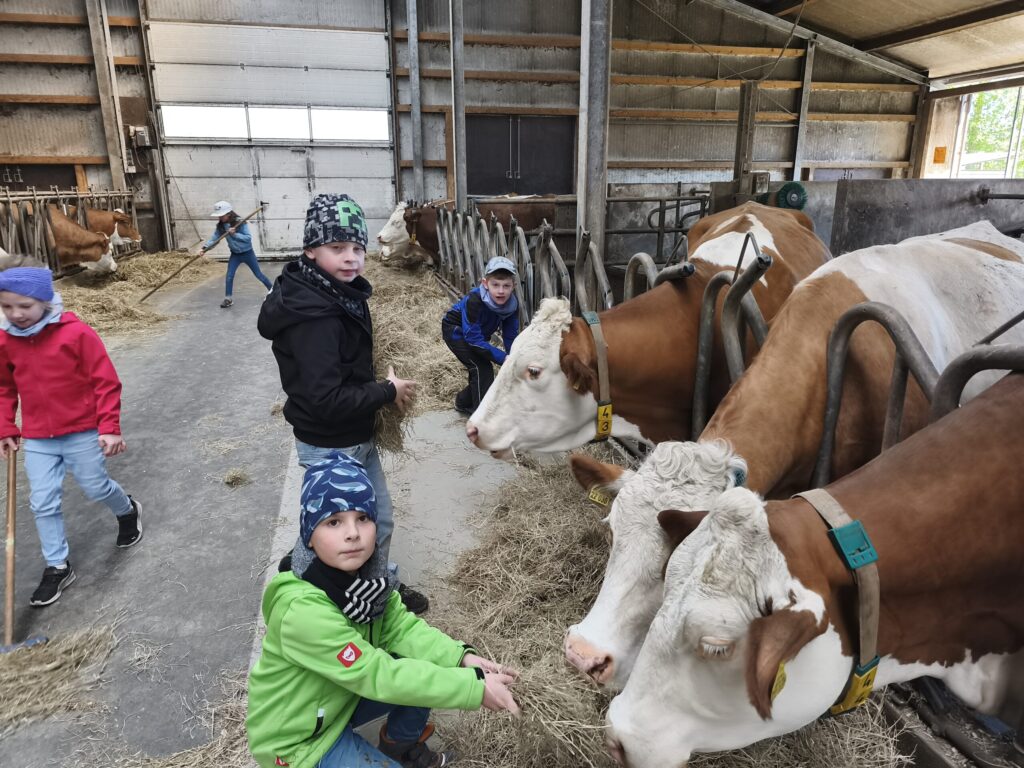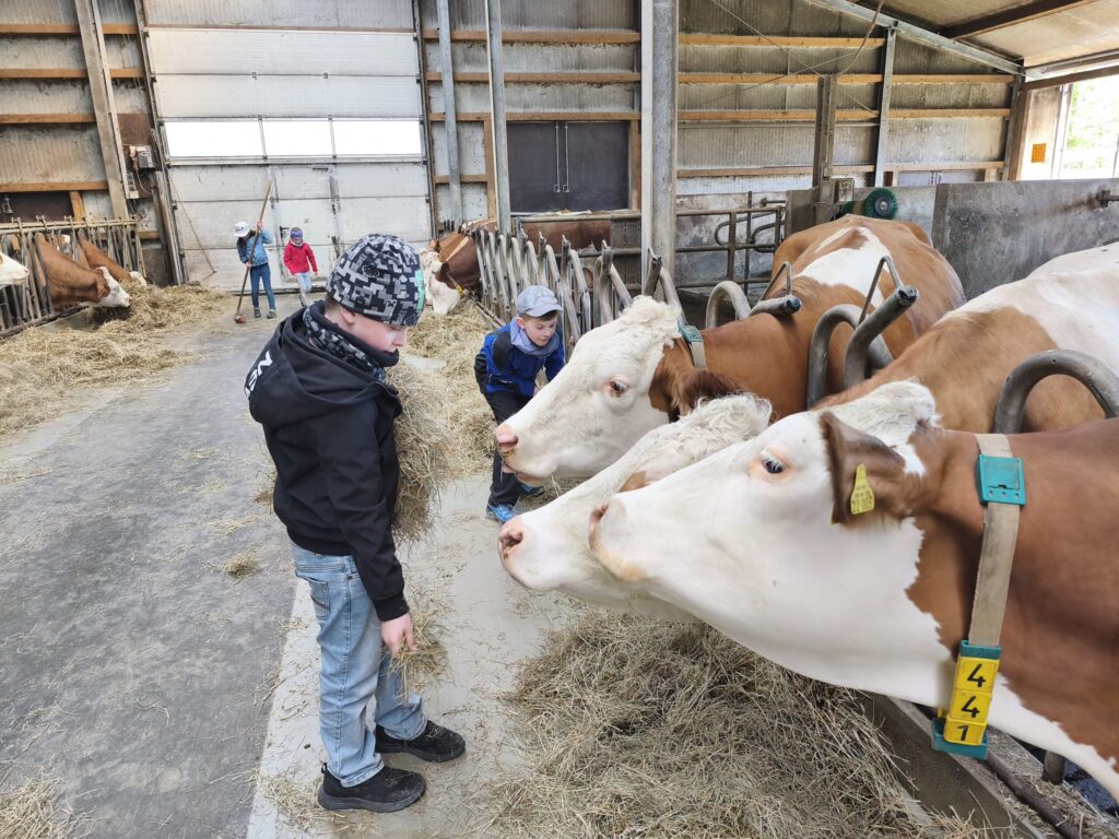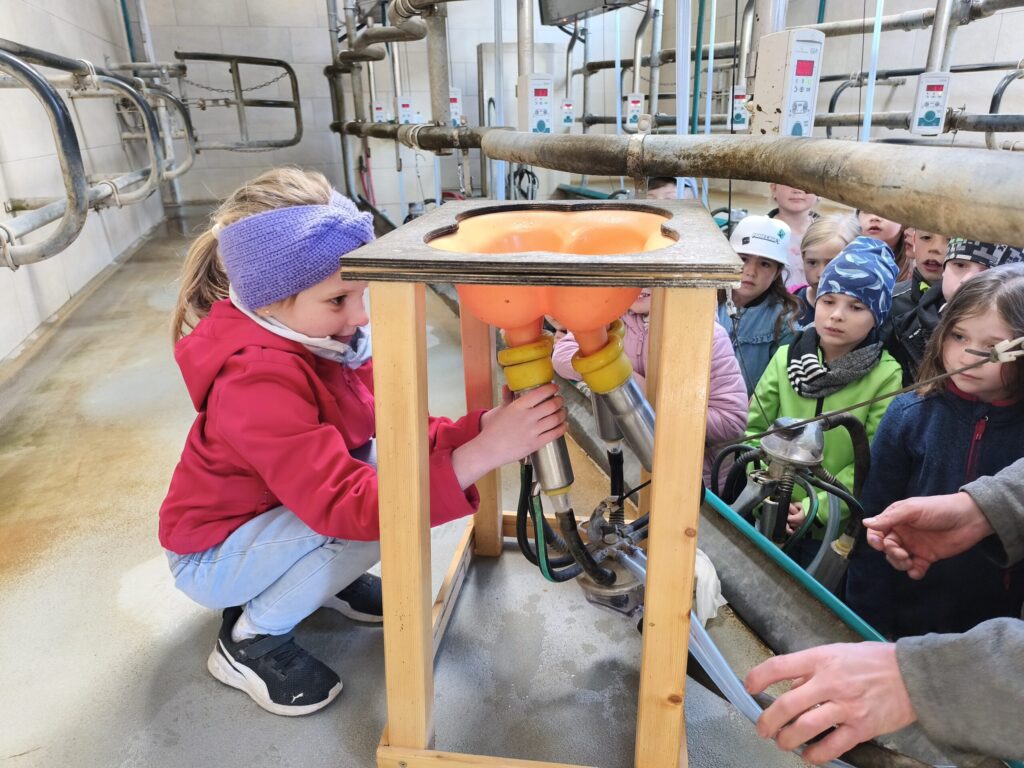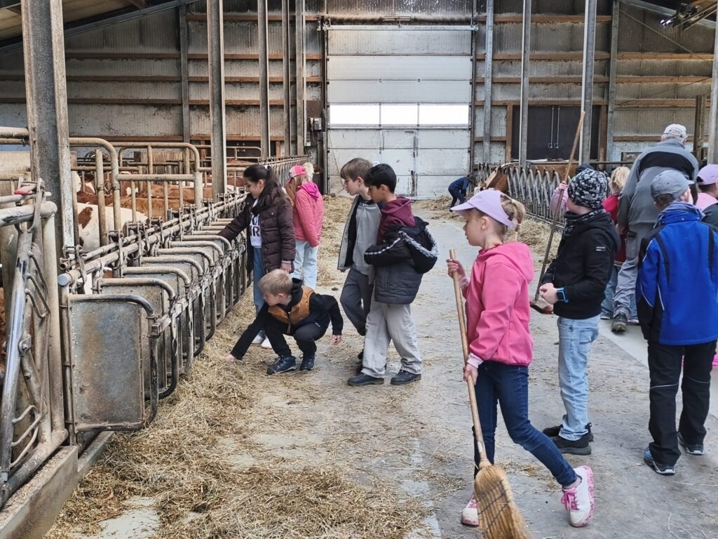 Herr Robert Kieninger vermittelte den Schülerinnen und Schülern mit großer Fachkenntnis, viel Geduld und spürbarer Begeisterung die Abläufe und Zusammenhänge der Milchviehtierhaltung. Besonders beeindruckend war das aktive Einbinden der Kinder: Sie durften Kühe und Kälber füttern, eine Melkmaschine kennenlernen und ausprobieren, Kälber streicheln sowie beim Zusammenrechen von Heu und Einstreu helfen und so erfahren, wie wichtig Sauberkeit im Stall ist.