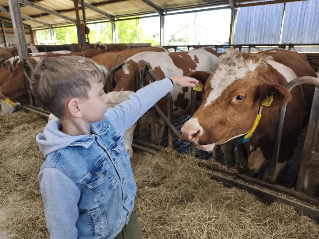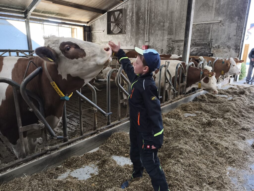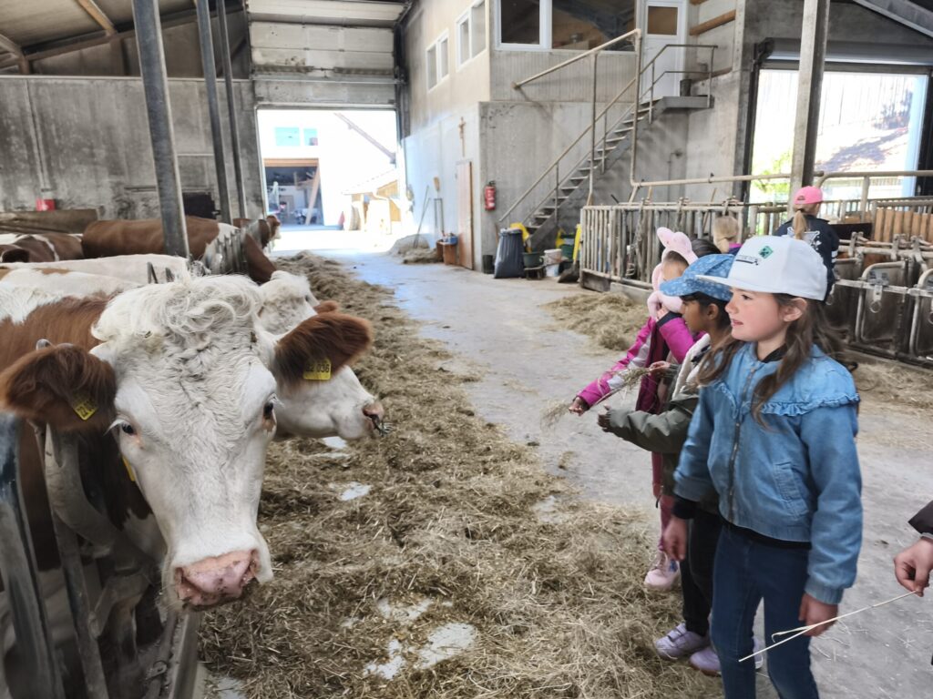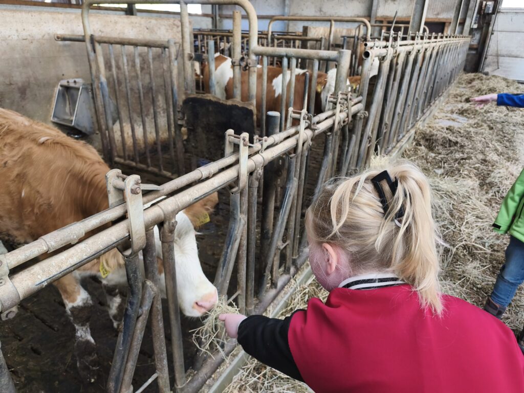 Herr Robert Kieninger vermittelte den Schülerinnen und Schülern mit großer Fachkenntnis, viel Geduld und spürbarer Begeisterung die Abläufe und Zusammenhänge der Milchviehtierhaltung. Besonders beeindruckend war das aktive Einbinden der Kinder: Sie durften Kühe und Kälber füttern, eine Melkmaschine kennenlernen und ausprobieren, Kälber streicheln sowie beim Zusammenrechen von Heu und Einstreu helfen und so erfahren, wie wichtig Sauberkeit im Stall ist.