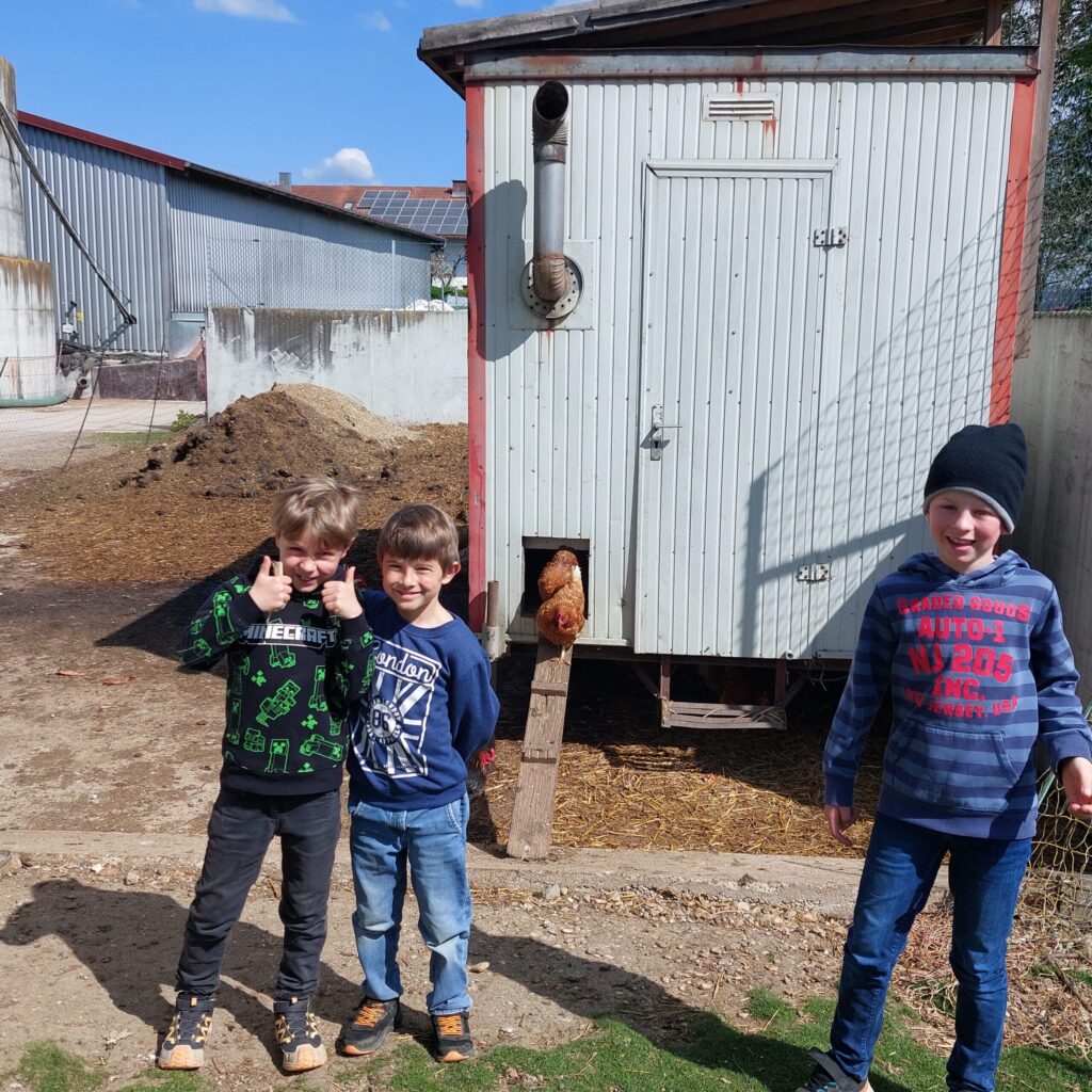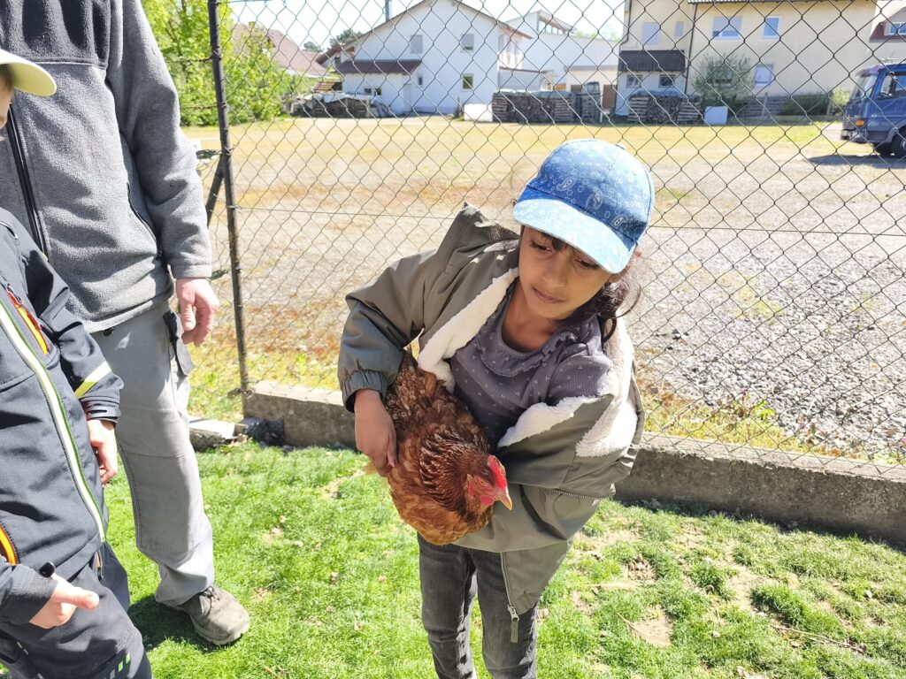 Auch andere Tiere des Hofes lernten die Kinder hautnah kennen: Hühner wurden gefüttert und gehalten, ebenso durften sie Hasen beobachten und versorgen. Durch diese unmittelbaren Erfahrungen wurde Landwirtschaft lebendig und verständlich.